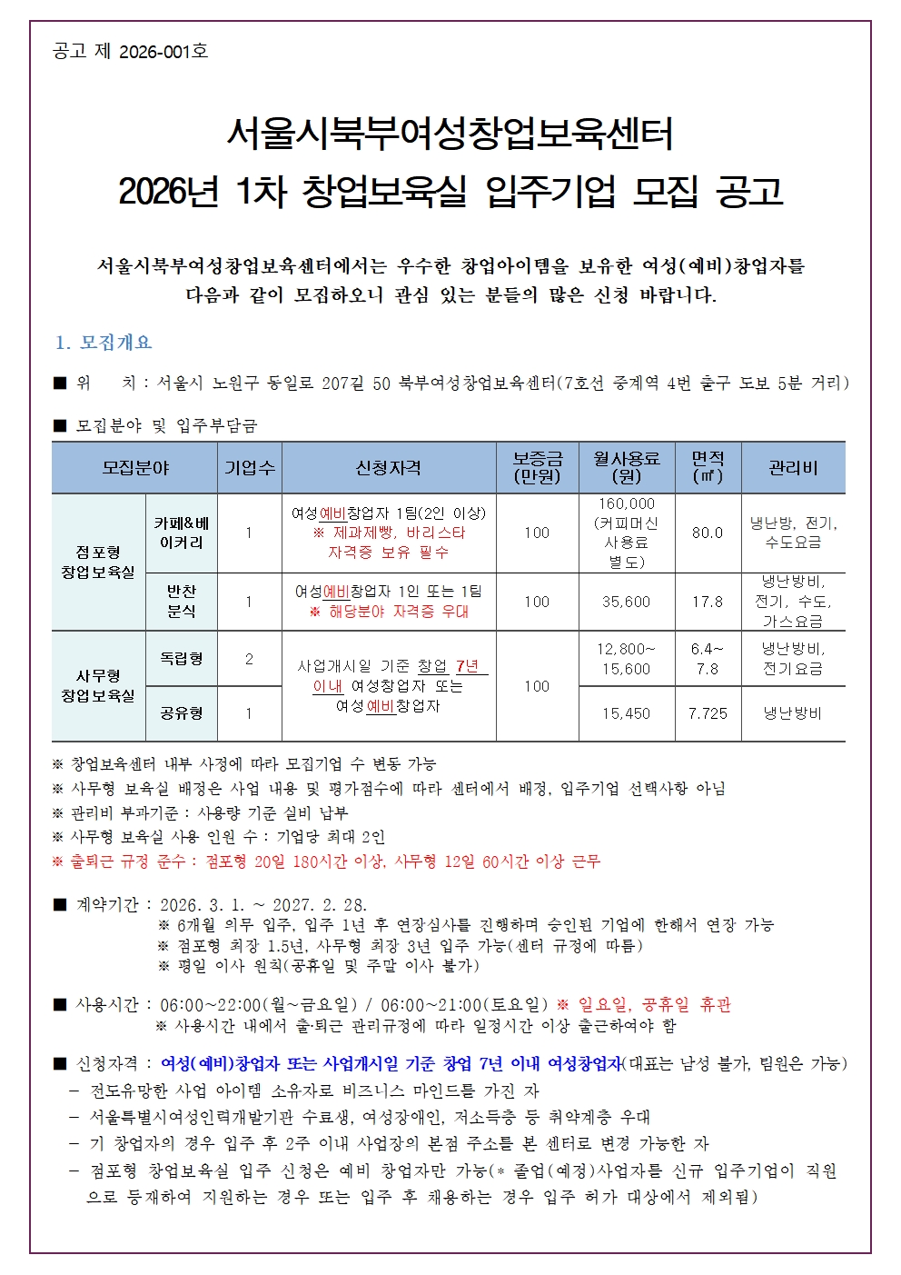 [공고] 북부여성창업보육센터 신규입주기업 모집(2026년 1차)